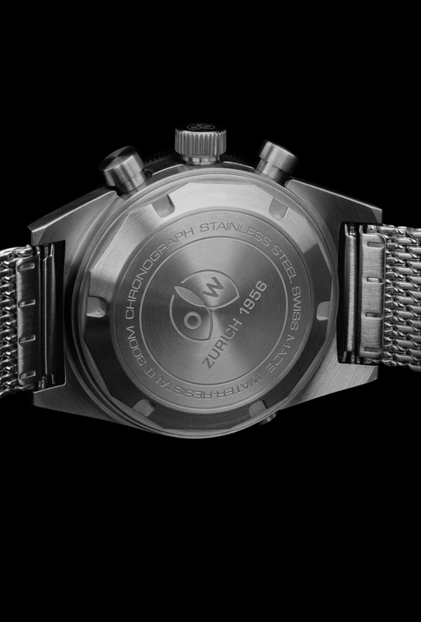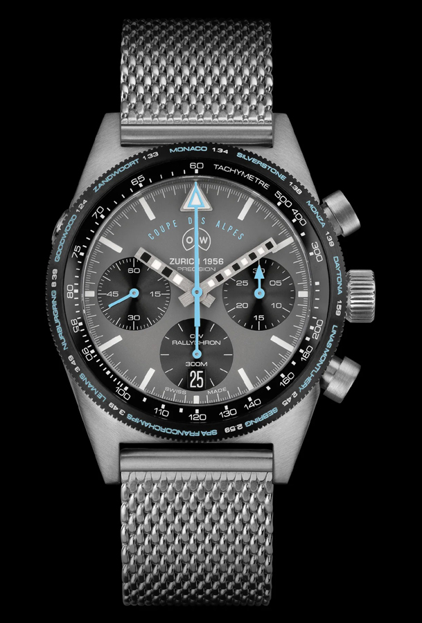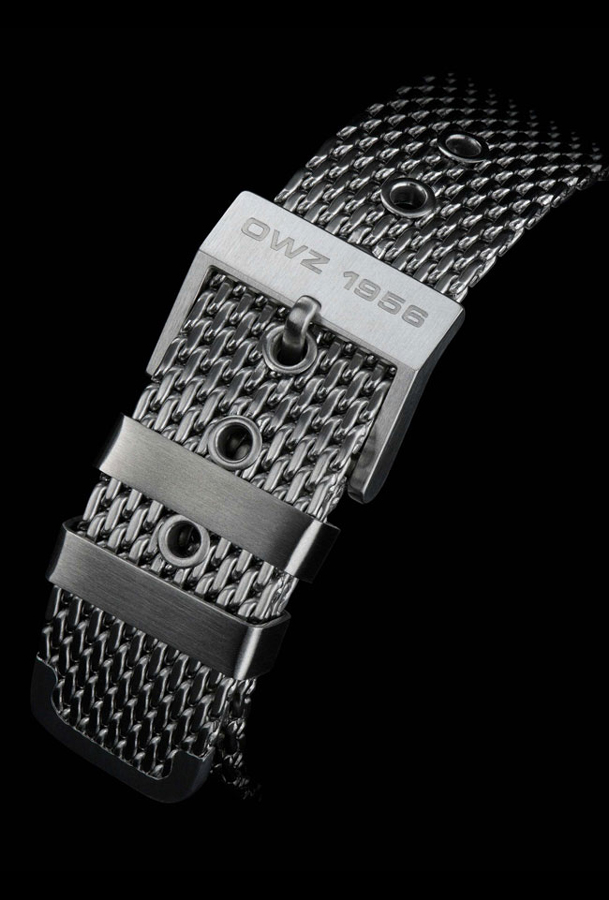 STRAPS: This version of the Rallychron is presented on a 20 mm hand-brushed stainless steel mesh M-Heritage strap with reinforced ends and an OWZ 1956 engraved pin buckle. It also comes with an Alpine blue nylon strap with a central white stripe and an OWZ 1956 engraved pin buckle